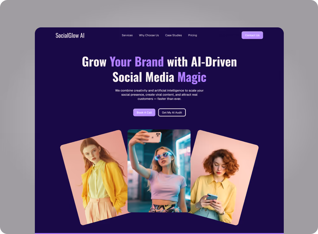 BrandGlow is a bold one-page Webflow landing page for social media agencies, content studios and independent creators.It combines vibrant visuals, AI-inspired details and a conversion-focused layout, so you can show your services, proof and pricing in one scroll and turn visitors into booked calls.
